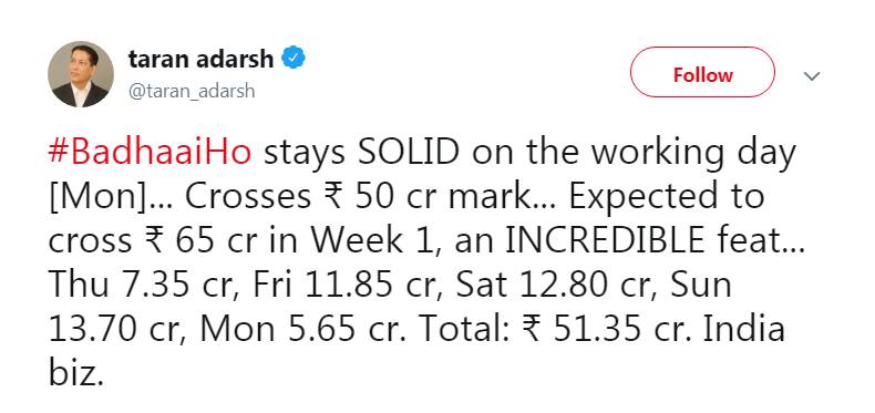 ट्रेड पंडित तरण आदर्श ने फिल्म के कमाई के आंकड़ों को साझा किया है। तरण के ट्वीट के मुताबिक, ‘बधाई हो’ वर्किंग डेज में भी सिनेमाघरों में मजबूती के साथ टिकी है। फिल्म ने 50 करोड़ के क्लब में एंट्री मार ली है। उम्मीद है कि फिल्म पहले वीक में 65 करोड़ रुपए का आंकड़ा छू लेगी। फिल्म की कमाई के आंकड़े शानदार हैं।