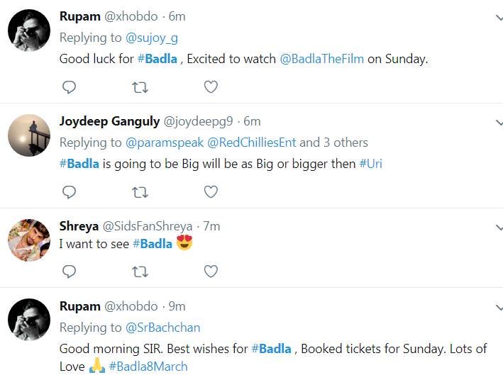 'बदला' फिल्म को देखने के बाद एक ट्विटर यूजर ने लिखा- 'अभी फिल्म बदला को देखा। आप फिल्म के क्लाइमैक्स और अंत का अंदाजा नहीं लगा सकते हैं। फिल्म को देखने के बाद मैं हैरान हूं।'