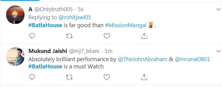 सोशल मीडिया यूजर्स बटला हाउस को मिशन मंगल से अच्छी बता रहे हैं। लोगों का कहना है कि जॉन अब्राहन ने शानदार परफॉर्मेंस दी है।