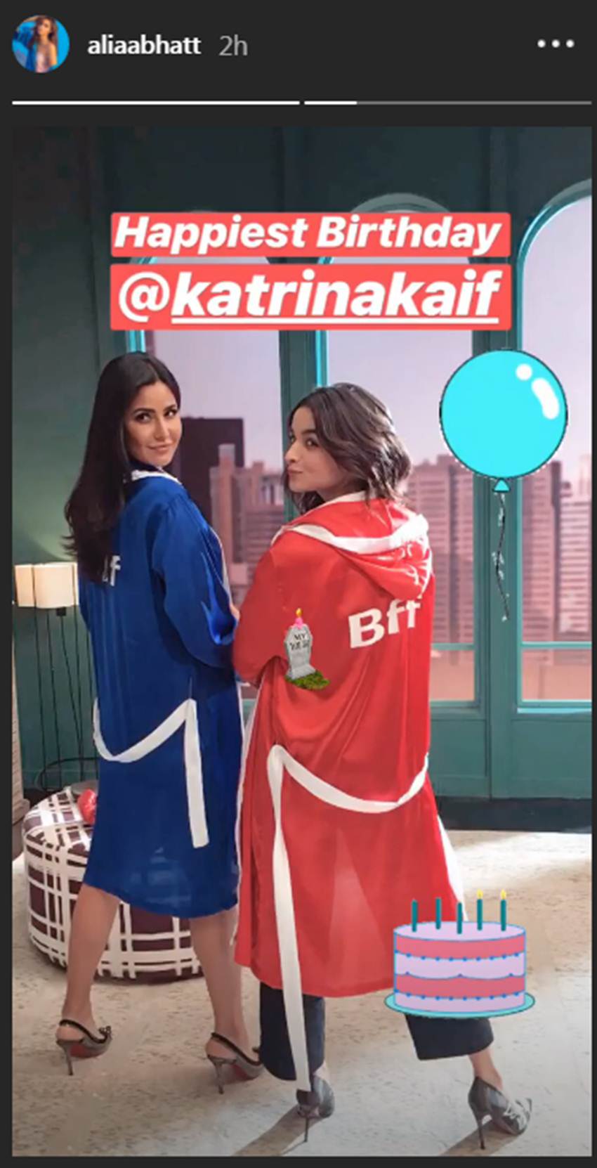 बॉलीवुड अभिनेत्री कैटरीना कैफ आज अपना 35 वां जन्मदिन सेलिब्रेट कर रही हैं। बॉलीवुड इंडस्ट्री के सितारे भी कैटरीना को सोशल मीडिया पर जन्मदिन की बधाई दे रहे हैं। लिस्ट में सबसे पहले नाम आता है कैटरीना की बेस्टफ्रेंड आलिया भट्ट का। आलिया ने इंस्टाग्राम स्टोरी पर कैटरीना के साथ एक तस्वीर शेयर की है। तस्वीर में आलिया ने रेड कलर का लॉन्ग कोट पहना है तो वहीं कैटरीना ने ब्लू कलर का कोट पहना हुआ है। दोनों ही एक्ट्रेस के कोट पर लिखा है-बीएफएफ (बेस्टफ्रेंड फॉरएवर)। आलिया ने फोटो के साथ कैप्शन लिखा, हैप्पियस्ट बर्थडे कैटरीना कैफ।