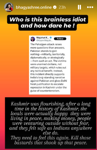 इस पोस्ट का एक स्क्रीनशॉट बॉलीवुड एक्ट्रेस भाग्यश्री ने अपने सोशल मीडिया हैंडल इंस्टाग्राम की स्टोरी पर शेयर किया और यूजर को खूब खरी खोटी सुनाई है। एक्ट्रेस ने लिखा, “ये दिमाग से पैदल, बेवकूफ कौन है और इसकी इतनी हिम्मत कैसे हुई। कश्मीर के इतिहास में लंबे समय के बाद खुशहाली आ रही थी, स्थानीय लोग वास्तव में खुश थे और शांति से रह रहे थे, पैसा कमा रहे थे, लोग बिना किसी डर के बाहर निकल रहे थे और वे बाकी भारतीयों की तरह सुरक्षित महसूस कर रहे थे। उन्हें फिर से यह महसूस करने की जरूरत है।” इसके आगे एक्ट्रेस ने गाली देते हुए लिखा कि उन्हें मार डालो, जिन्होंने ये शांति छीनने की कोशिश की।
