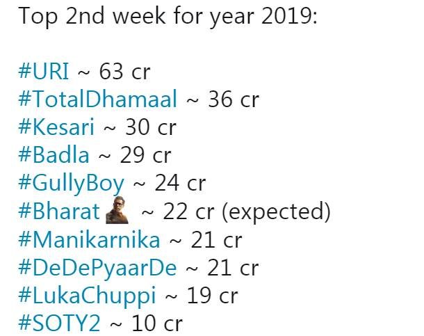 ट्रेड एनालिस्ट राज बंसल ने एक ट्वीट में लिखा कि सलमान खान की फिल्म भारत ने दूसरे वीक के पहले शुक्रवार को 3 करोड़ रुपए की कमाई की है।