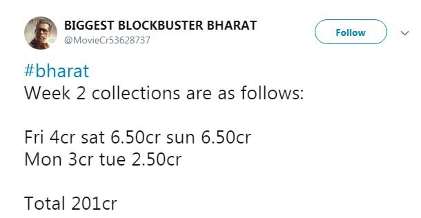 एक ट्विटर यूजर ने फिल्म की कमाई को लेकर लिखा- भारत का 200 करोड़ की कमाई करना आसान नहीं था। हालांकि सलमान खान के कारण यह काम भी आसान हो जाता है। सलमान खान ने एक बार फिर से खुद को साबित कर दिया है।