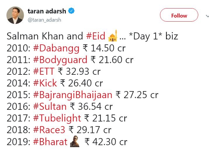 ट्रेड एनालिस्ट तरण आदर्श ने एक ट्वीट में इस साल रिलीज हुई टॉप 5 फिल्मों (ओपनिंग डे की कमाई पर) के बारे में जानकारी दी है। भारत ने पहले दिन 42 करोड़ 30 लाख, दूसरे नंबर पर कलंक 21 करोड़ 60 लाख, तीसरे नंबर पर केसरी 21 करोड़ 6 लाख, चौथे नंबर पर गली बॉय 19 करोड़ 40 लाख और टोटल धमाल पांचवें नंबर पर 16 करोड़ 50 लाख रुपए की कमाई के साथ विराजमान है।