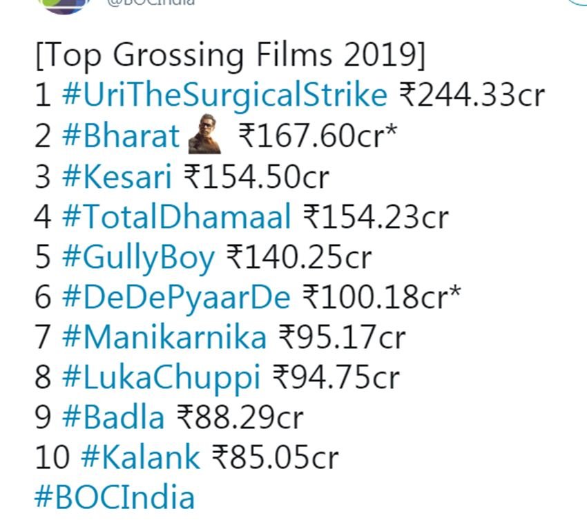 ट्रेड एनालिस्ट तरण आदर्श ने साल 2019 की कमाई के मामले में टॉप-5 फिल्मों की लिस्ट साझा की है। पहले नंबर पर उरी, दूसरे स्थान पर भारत (कमाई जारी), तीसरे स्थान पर केसरी, चौथे नंबर पर टोटल धमाल और पांचवें नंबर पर गली बॉय विराजमान है।