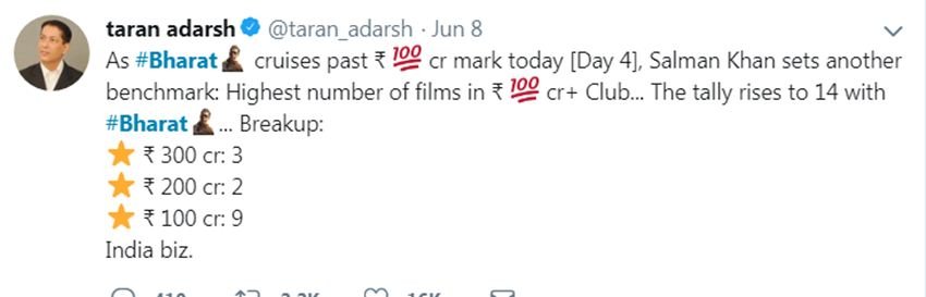 ट्रेड एनालिस्ट तरण आदर्श ने एक ट्वीट में लिखा- भारत को लेकर निगाहें अब 175 करोड़ पर टिकी हुई हैं। साथ ही देखना होगा कि फिल्म ने पहले वीक में कितनी कमाई की। वर्ल्डकप मैच के चलते भी फिल्म ने रविवार (16 जून) को ठीक-ठाक कमाई की थी।