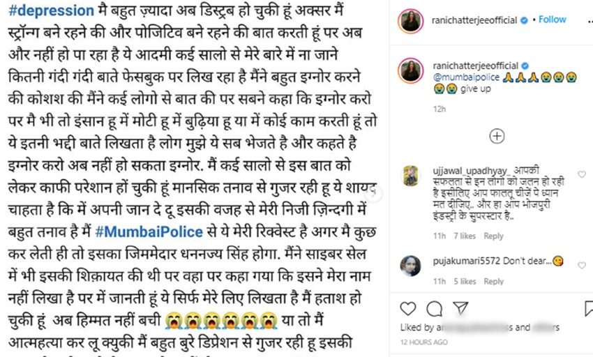 रानी ने आगे कहा- ‘ लोग मुझे ये सब भेजते हैं और कहते हैं कि इग्नोर करो। अब नहीं हो सकता इग्नोर। मैं कई सालों से इस बात को लेकर परेशान हो चुकी हूं। मानसिक तनाव से गुजर रही हूं। यह चाहता है कि शायद मैं अपनी जान दे दूं। इसकी वजह से मेरी पर्सनल लाइफ में भी काफी परेशानियां हैं। मुंबई पुलिस से मेरी रिक्वेस्ट है अगर मैं कुछ कर लेती हूं तो इसका जिम्मेदार धनन्जय सिंह होगा।’