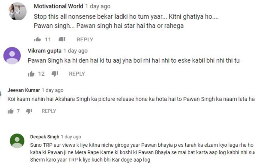 वही अक्षरा के इल्जामों पर पवन सिंह के एक फैन ने लिखा- तुम्हारे कहने से शेर की बादशाहत थोड़े ना कम होगी। एक फैन ने लिखा, बंद करो ये बकवास की बातें। बेकार लड़की हो तुम यार…कितनी घटिया हो…पवन सिंह पवन सिंह है, स्टार है, था और रहेगा। एक ने लिखा, पवन सिंह को बदनाम कर रही हो अक्षरा गलत बात है। एक और यूजर ने लिखा, पैसे और पद के लिए अपने स्वाभिमान से समझौता करने वाले के संस्कार कमजोर होते हैं। एक अन्य ने लिखा, पवन सिंह आज जिसे जगह है वहां पर उनका तुम कुछ नहीं बिगाड़ सकती हो।