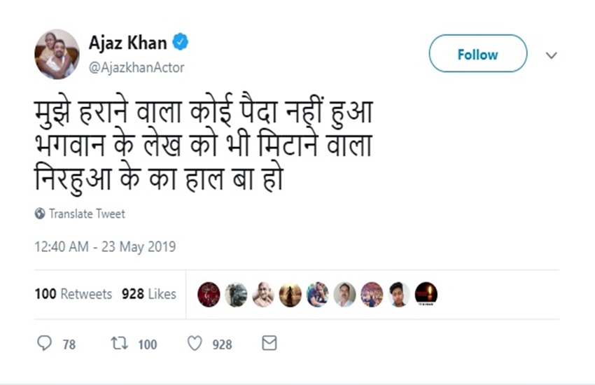 Dinesh Lal Yadav: सत्रहवीं लोकसभा के गठन के लिए वोटों की गिनती जारी है। रुझानों की मानें तो इस बार भी भाजपा सरकार बना रही है। वहीं आजमगढ़ से बीजेपी के टिकट से चुनाव लड़े भोजपुरी एक्टर दिनेश लाल यादव की हार लगभग तय है। इस बीच एक्टर एजाज खान ने एक बार फिर निरहुआ को ट्रोल करते हुए व्यंगात्म ट्वीट किया है। इस ट्वीट की खास बात यह है कि ट्वीट में एजाज ने भोजपुरी भाषा का भी प्रयोग किया है। एजाज खान ने ट्वीट किया- ‘मुझे हराने वाला कोई पैदा नहीं हुआ भगवान के लेख को भी मिटाने वाला निरहुआ के का हाल बा हो’। आपको बता दें कि एजाज खान ने हाल ही में अपने एक और ट्वीट में दिनेश लाल यादव पर निशाना साधते हुए कहा था कि निरहुआ को ईवीएम के गायब होने की बात पहले से ही पता थी इसलिए वह रह रहा था कि मुझे भगवान भी नहीं हराएगा।