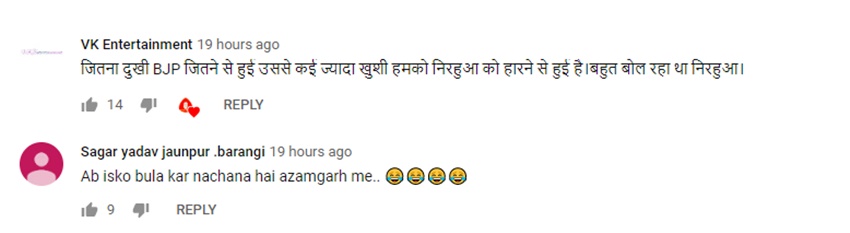 सागर यादव नाम के एक यूजर ने दिनेश लाल के हार पर लिखा- अब इसको बुलाकर नचाना है आजमगढ़ में। वहीं एक अन्य यूजर ने अखिलेश यादव की जीत पर खुशी मनाते हुए लिखा, ‘बड़ी-बड़ी फेंक रहे थे निरहु, निहुर के चलेगा अब। कोई माई का लाल पैदा नहीं हुआ था ऐसा बोल रहा था। निरहुआ भगवान के लेखक को भी मिटा सकता हूं बीजेपी के बीजेपी को जीतने से खुशी है मेरे को लेकिन निरहुआ के हारने से बहुत ज्यादा खुशी है।’ तो एक और यूजर ने उनकी फिल्म नहीं चलने की बात कहते हुए लिखा-‘अब हम इसकी फिल्म नहीं चलने देंगे यादव समाज के लोग। ‘