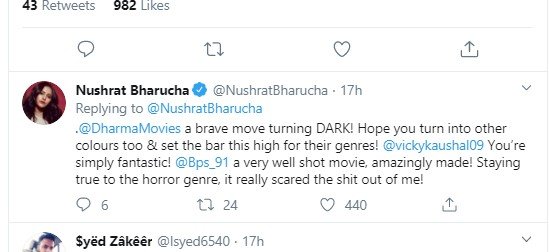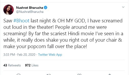 फिल्म भूत नुसरत भरूचा ने भी देखी। उन्होंने इस फिल्म को देखने के बाद फिल्म बनाने वालोंऔर फिल्म कलाकारों की भी खूब तारीफ की। नुसरत ने लिखा- ओह माय गॉड मैं थिएटर में सन्ना गई। मेरे आस पास के लोग बुरी तरह से डरे हुए थे। ऐसी पहली हिंदी मूवी है जिसे देख कर सब इतना डर रहे हैं। ये फिल्म आपको अपनी सीट पर कांपने पर मजबूर कर देगी। आपके सारे पॉपकर्न सीटपर बिखर जाएंगे।