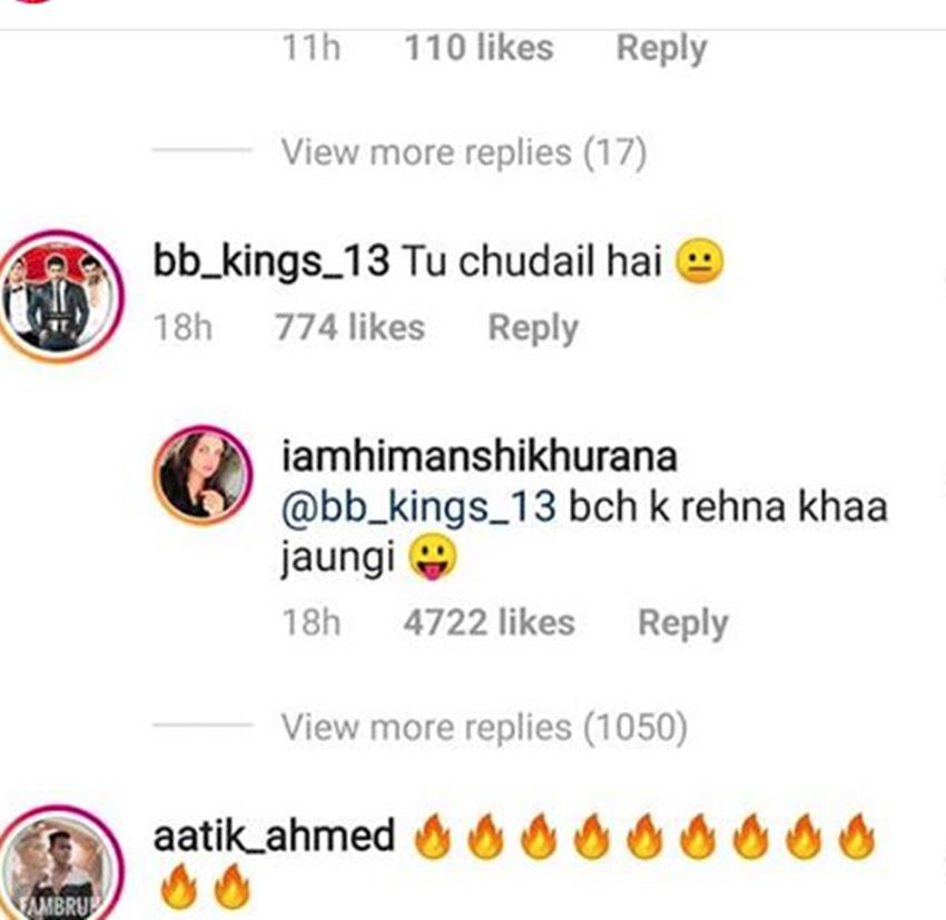हिमांशी ने बदले में कड़क जवाब देते हुए कहा- ‘बचके रहना खा जाऊंगी।’ हिमांशी सपोर्टर्स ने उनके इस कमेंट को खूब सराहा और इसे 4725 लाइक्स मिले। हिमांशी के फैंस इस बीच बोल पड़े क्या बात मैडम। एक फैन ने कहा- इसी तेवर के हम आपके फैन हैं। तो कोई बोला- ‘क्या जवाबदिया है आपने हिमांशी बेचारे की बोलती बंद हो गई।’