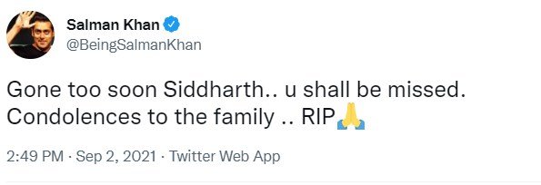 सिद्धार्थ शुक्ला के निधन पर सुपरस्टार सलमान खान का भी रिएक्शन सामने आया है। सलमान खान ने एक पोस्ट किया है जिसमें उन्होंने भावुक होकर सिद्धार्थ के लिए लिखा- तुम बहुत जल्दी चले गए सिद्धार्थ। तुम बहुत याद आओगे। परिवार के लिए बहुत दुख है।