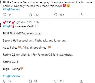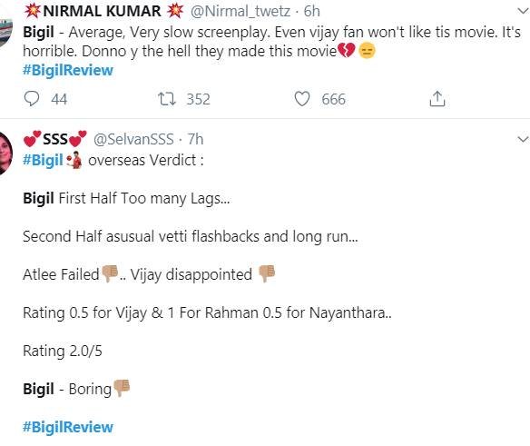 विजय की फिल्म को मिल रही मिली जुली प्रतिक्रिया..बिगली को लेकर कहा जा रहा है कि फिल्म बहुत स्लो है। कई लोगों ने इसे एवरेज कहा। इतना ही नहीं, कहा जा रहा है कि विजय के फैंस भी खुद उनकी इस फिल्म को पसंद नहीं कर रहे हैं।