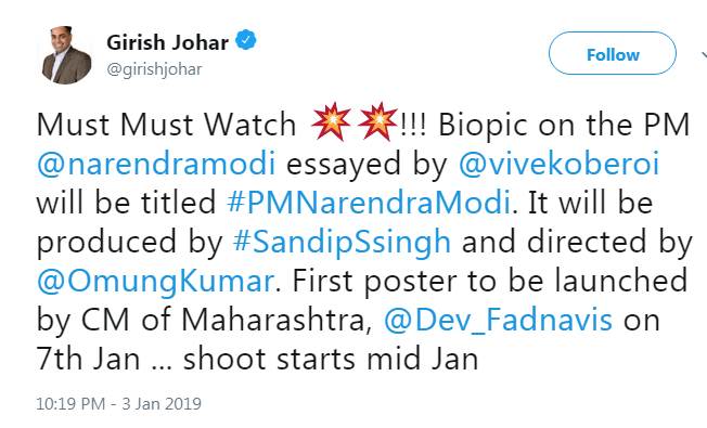 गिरिश ने ट्वीट में लिखा- ”जरुर,जरुर देखें। प्रधानमंत्री नरेंद्र मोदी की बायोपिक में विवेक ओबरॉय होंगे। फिल्म का नाम पीएम नरेंद्र मोदी होगा। फिल्म के निर्माता संदीप एस सिंह होंगे और फिल्म का निर्देशन ओमंग कुमार करेंगे। फिल्म का पहला पोस्टर महाराष्ट्र के मुख्यमंत्री देवेंद्र फडणवीस 7 जनवरी को लॉन्च करेंगे। फिल्म की शूटिंग जनवरी के मध्य से शुरू हो जाएगी।