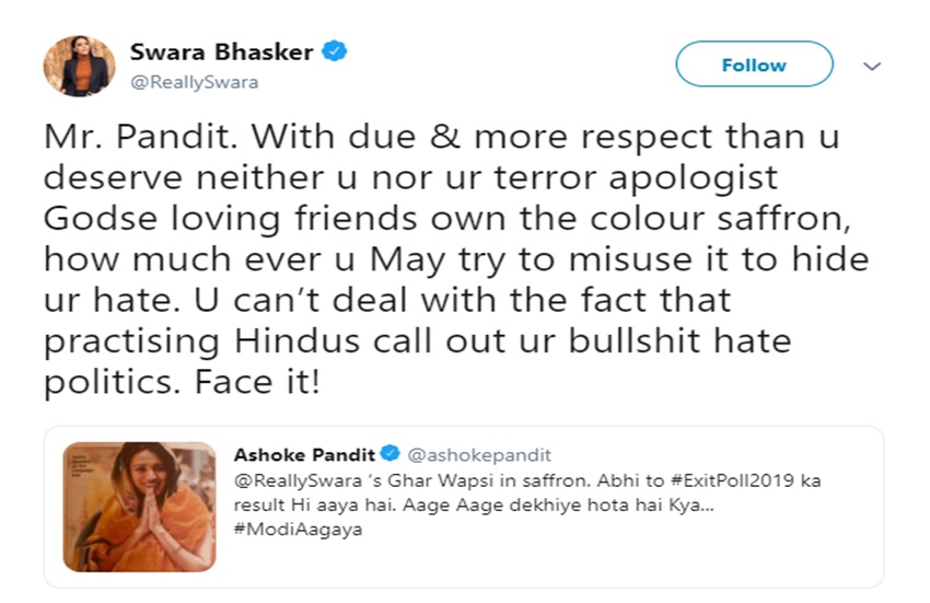 इंटरव्यू वाले पेज पर मीडिया हाउस ने उनकी सैफरोन पहनीं साड़ी वाली तस्वीर लगाई है। इसी तस्वीर को फिल्ममेकर अशोक पंडित ने अपने ट्विटर हैंडल से शेयर करते हुए स्वरा पर व्यंग करते हुए लिखा, ‘स्वरा की सैफरोन में घर वापसी। अभी तो एग्जिट पोले का रिजल्ट ही आया है। आगे-आगे देखिए होता है क्या। इस पर स्वरा ने भी उनको करारा जवाब दिया है।’