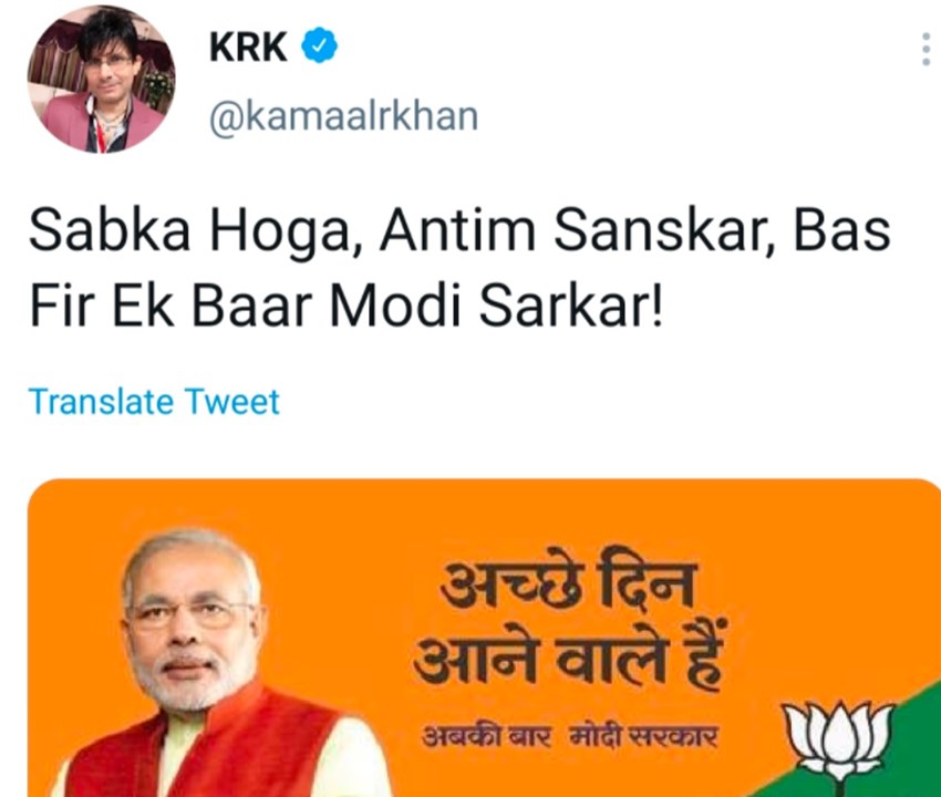 केआरके ने एक और पोस्ट किया, जिसमें उन्होंने पीएम मोदी के बैनर वाली एक फोटो शेयर की। इसमें लिखा था- ‘अच्छे दिन आने वाले हैं, अब की बार मोदी सरकार।’ इस पोस्ट पर कैप्शन के साथ एक्टर ने तंज कसते हुए लिखा-सबका होगा अंतिम संस्कार, बस फिर एक बार मोदी सरकार।’