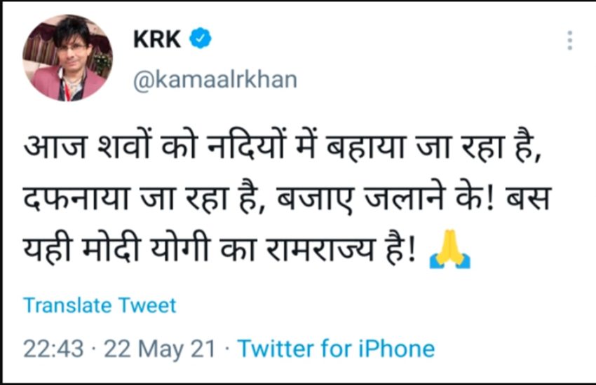 कोविड महामारी की दूसरी लहर ने भारत पर बुरी तरह कहर ढाया है। अब भी हर दिन 2 लाख से अधिक संक्रमण के मामले दर्ज़ हो रहे हैं और दो हजार से अधिक लोगों के मौत की खबरें हैं। उत्तर प्रदेश और बिहार के ग्रामीण इलाकों में भी इस महामारी का भयंकर प्रकोप देखने को मिल रहा है। संदिग्ध कोविड मरीजों के शवों को गंगा में प्रवाहित करने का मामला भी सामने आता रहा है। उत्तर प्रदेश के प्रयागराज में गंगा का किनारा शवों से अटा पड़ा है जहां शवों को रेत में दफन किया जा रहा है। उन्नाव जिले से भी सैकड़ों लाशों को गंगा किनारे दफन करने का मामला सामने आया था। इसी दुर्दशा पर बॉलीवुड एक्टर कमाल आर ख़ान (KRK) ने उत्तर प्रदेश के मुख्यमंत्री योगी आदित्यनाथ और प्रधानमंत्री नरेंद्र मोदी पर तंज़ कसा है।