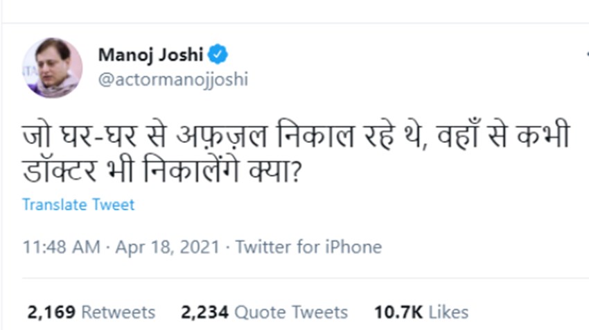 मनोज जोशी ने तंज करते हुए लिखा ‘जो घर घर से अफजल निकाल रहे थे, वहां से कभी डॉक्टर भी निकालेंगे क्या?’ उनके इस ट्वीट पर तमाम लोगों की प्रतिक्रिया भी सामने आने लगी। चर्चित डॉक्टर और कॉलमनिस्ट शाह आलम खान ने जवाब देते हुए लिखा, ‘जोशी साहेब आदाब, सुना है आप ढूंढ रहे हैं हम जैसों को? हुकुम करिए क्या काम था? सेवा में हाज़िर हैं।’