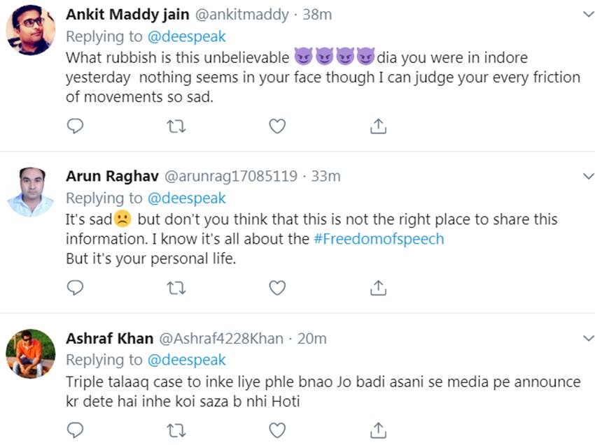 दिया की इस पोस्ट पर उनके फैन्स अपना रिएक्शन जाहिर कर रहे हैं। फैन्स का कहना है कि एक्ट्रेस की इस पोस्ट ने उन्हें रूला दिया। एक यूजर ने लिखा- इस पोस्ट को देखकर मेरी आंखें नम हो गईं। लेकिन आपको आने वाली नई जिंदगी के लिए शुभकामनाएं। वहीं एक अन्य यूजर ने लिखा- मेरा दिल भर आया। आप दोनों को साथ देखकर खुशी मिलती थी। वहीं एक अन्य सोशल मीडिया यूजर ने लिखा- क्या बकवास है, मुझे इस पर विश्वास नहीं हो रहा है। कल आप इंदौर में थीं और आपके चेहरे पर कुछ भी दिखाई नहीं पड़ा। वहीं एक यूजर लिखता है- तलाक तलाक केस तो इन पर लगाओ जो बड़ी आसानी से सोशल मीडिया पर लिख देते हैं।