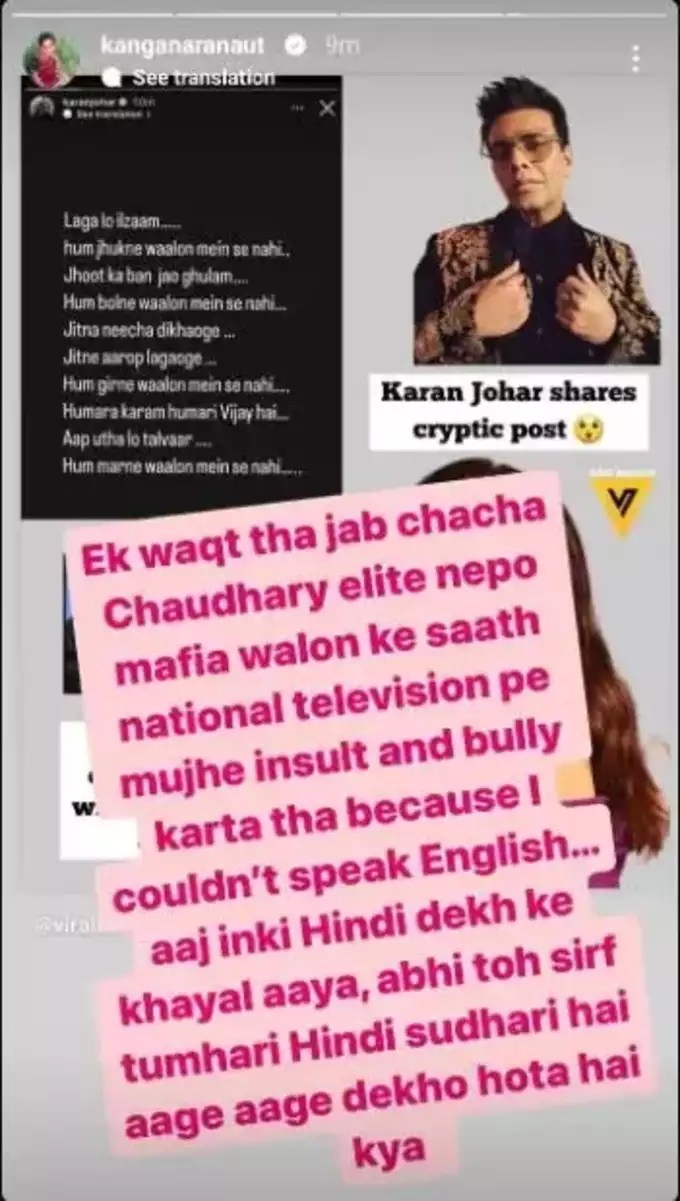 कंगना रनौत ने अपनी इंस्टाग्राम स्टोरी पर करण जौहर के पोस्ट को शेयर करते हुए लिखा कि ‘एक वक्त था जब चाचा चौधरी एलीट नेपो माफिया वालों के साथ नेशनल टेलीविजन पर मुझे इंसल्ट और बुली करता था, क्योंकि मैं इंग्लश नहीं बोल पाती थी। आज इनकी हिंदी देख कर ख्याल आया, अभी तो सिर्फ तुम्हारी हिंदी सुधारी है, आगे आगे देखो होता है क्या।’