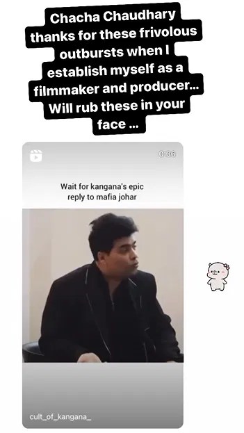 अब कंगना रनौत ने करण का यह वीडियो अपनी इंस्टाग्राम स्टोरी पर शेयर करते हुए लिखा कि ‘शुक्रिया चाचा चौधरी। आपके इन शब्दों के लिए। मैं खुद को एक फिल्ममेकर और प्रड्यूसर के तौर पर साबित कर चुकी हूं। मैंने तो जो कुछ कहा, आपके मुंह पर कहा था।’ बता दें कि कंगना जब करण जौहर के शो कॉफी विद करण में आई थीं। तो उन्होंने इस दौरान करण को नेपोटिज्म का कर्ता धर्ता और मूवी माफिया कहा था।’