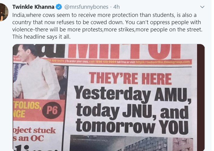 यहां छात्र नहीं गाय सुरक्षित हैं। अक्षय कुमार की पत्नी ने किया ये ट्वीट..