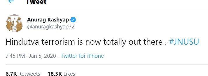 अनुराग कश्यप ने भी जेएनू घटना पर ट्वीट किया। उन्होंने लिखा- 'हिंदुत्व टेररिज्म'हद से आगे बढ़ गया है।
