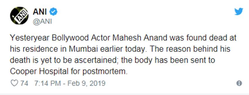 रिपोर्ट्स के मुताबिक एक्टर अपने आखिरी वक्त में बिलकुल अकेले थे। बता दें, एक्टर शनिवार सुबह मुंबई स्थित अपने घर पर मृत पाए गए थे। पुलिस के मुताबिक वह कई सालों से अकेले रह रहे थे। पुलिस ने अनुमान लगाते हुए कहा है कि शायद उनकी मौत दो दिन पहले हो चुकी थी। ऐसे में उनके सड़े हुए शव को कूपर अस्पताल पोस्टमॉर्टम के लिए भेजा गया है ताकि उनकी मौत के समय और वजहों का पता चल सके।
