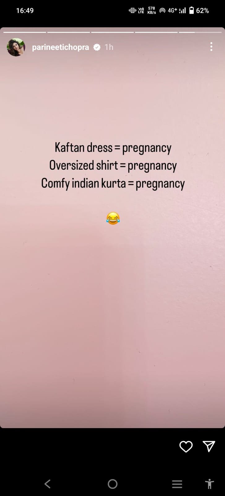 परिणीति चोपड़ा की प्रेग्नेंसी की अफवाहें काफी समय से चल रही हैं। पति राघव चड्ढा से शादी के कुछ महीनों के बाद उनकी प्रेग्नेंसी को लेकर अटकलें लगने लगीं। वहीं अब इन खबरों पर फुल स्टॉप लगाते हुए परिणीति ने अपनी इंस्टास्टोरी पर पोस्ट शेयर करते हुए लिखा कि ‘काफ्तान ड्रेस=प्रेग्नेंसी, ओवरसाइज़्ड शर्ट=प्रेग्नेंसी, आरामदायक ट्रेडिशनल कुर्ता=प्रेग्नेंसी’ और साथ में जोर से हंसते हुए इमोजी भी।