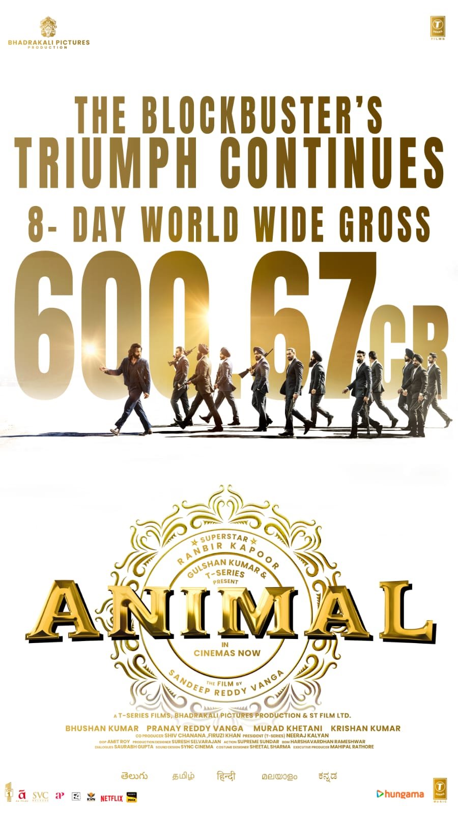 रणबीर कपूर की ‘एनिमल’ ने 8 दिन में ही दुनियाभर में ताबड़तोड़ कमाई की है। फिल्म ने 8 दिन में 600 करोड़ का आंकड़ा पार कर लिया है। फिल्म ने वर्ल्डवाइड 600.67 करोड़ का बिजनेस कर लिया है।