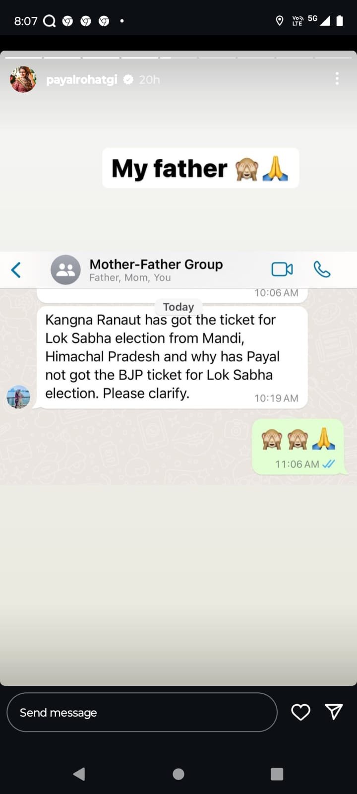 कंगना रनौत मंडी से चुनाव लड़ने वाली हैं। इसे लेकर पायल रोहतगी ने तंज कसा है। उन्होंने इंस्टाग्राम स्टोरी पर अपने पिता का एक मैसेज शेयर करते हुए क्रिप्टिक पोस्ट शेयर किया।
