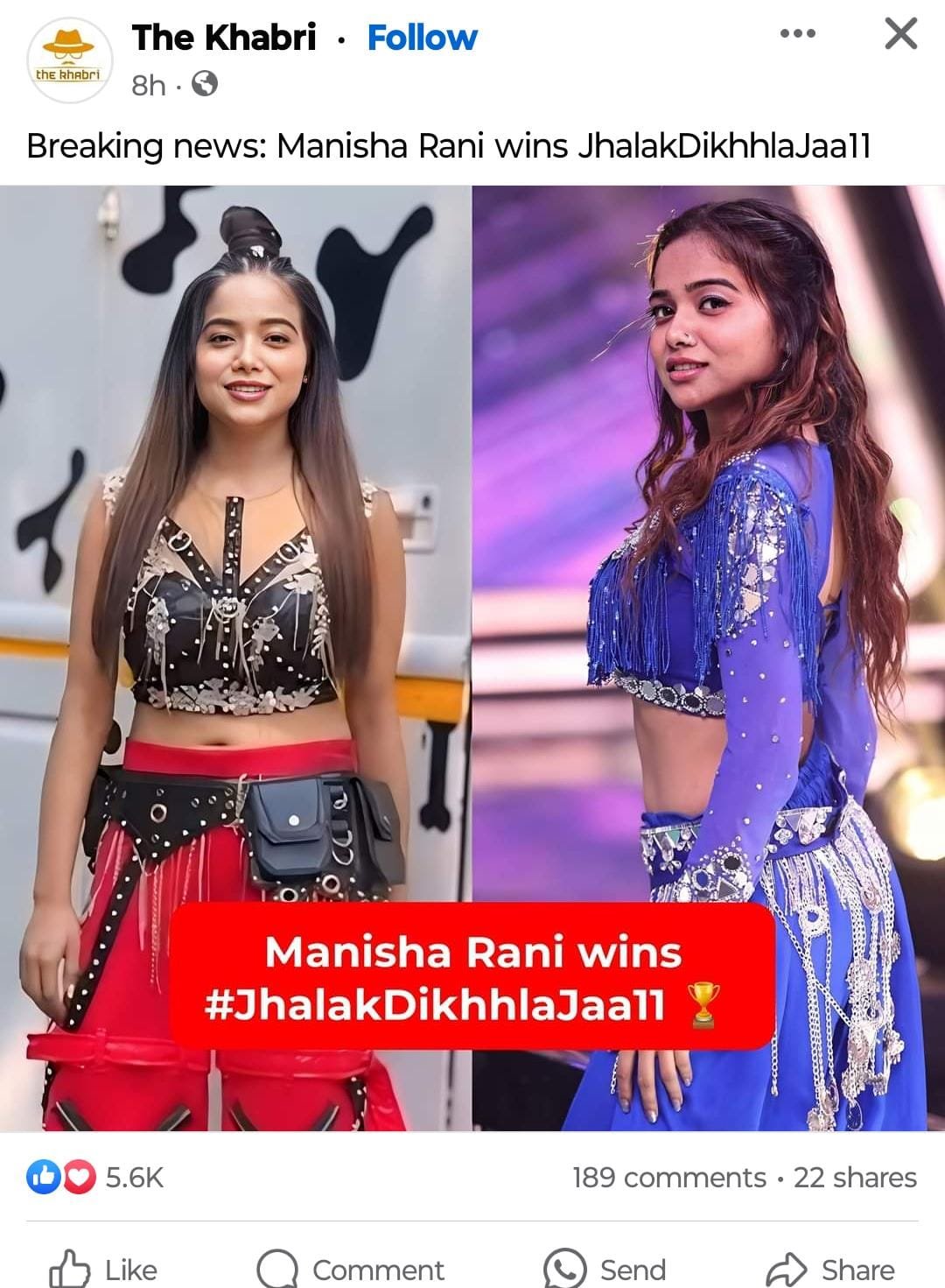 टीवी रियलिटी शो ‘झलक दिखला जा 11’ का ग्रैंड फिनाले 2 मार्च को होने वाला है। इसमें टॉप 5 कंटेस्टेंट्स के बीच जबरदस्त टक्कर देखने के लिए मिलने वाली है। इसी बीच शो के विनर का ऐलान कर दिया गया है। ये खबर ‘द खबरी’ द्वारा शेयर की गई है। मनीषा रानी को इसका विनर बताया जा रहा है। खैर, अब ये तो ग्रैंड फिनाले के बाद ही पता चल पाएगा कि विनर कौन बनता है।