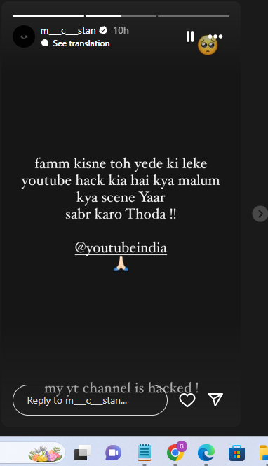 BB 16 विनर और रैपर एमसी स्टैन का यूट्यूब चैनल हैक हो गया है और इसकी जानकारी खुद स्टैन ने फैंस को दी है।