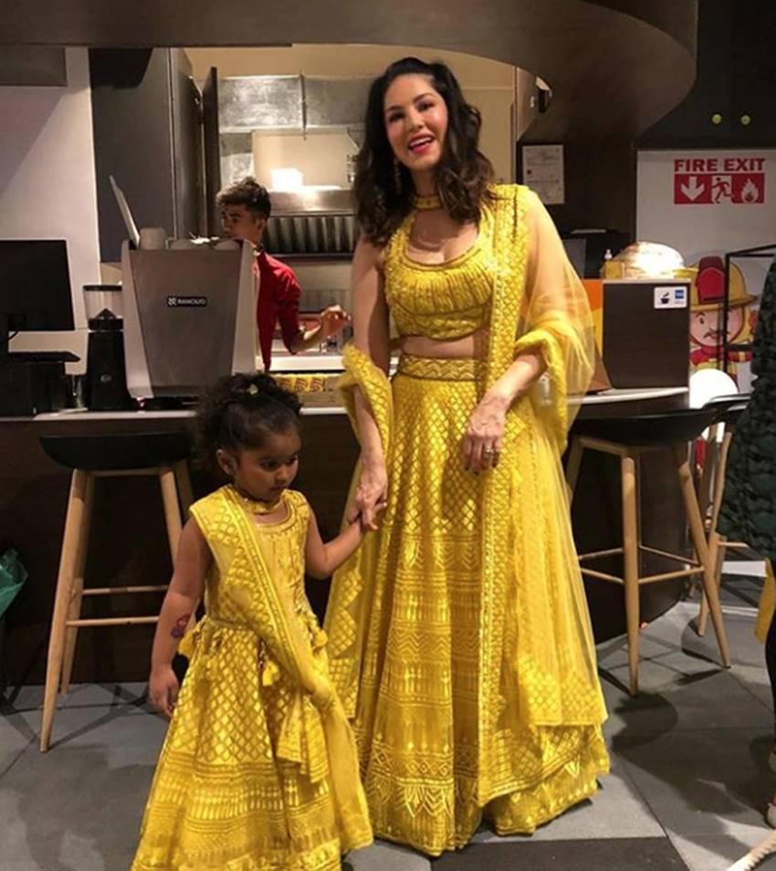 अपनी बेटी नीशा के साथ सनी लियोनी येलो लहंगे में एक जैसे ड्रेस पहने हुए।