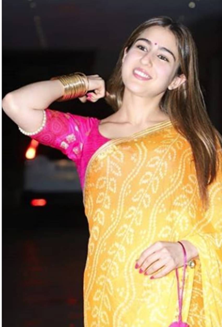 सारा अली खान येलो साड़ी और पिंक ब्लाउज कॉम्बिनेशन के साथ बेहद खूबसूरत लग रही थीं।