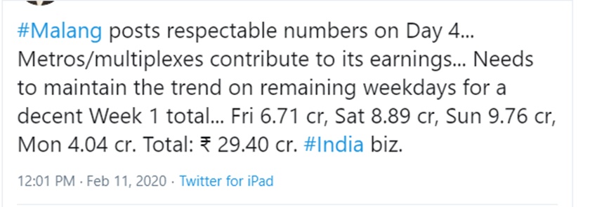 मलंग ने वीकेंड पर कुल 25.36 करोड़ रुपए कमाए हैं। वहीं आदित्य की पिछली सबसे हिट फिल्म आशिकी 2 ने 20.50 करोड़, दावत-ए-इश्क ने 13.60, फितूर ने 14.11 तो ओके जानू ने 13.80 करोड़ का बिजनेस किया था। इसमें कलंक के आंकड़ों को शामिल नहीं किया गया है।