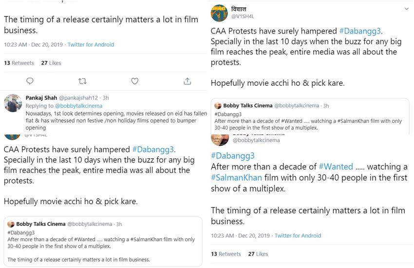 फिल्म रिलीज से पहले अंदाजे लगाए जा रहे थे कि ‘पिछले 10 दिनों से CAA प्रोटेस्ट को लेकर हालत काफी नाजुक बनी है।’ मीडिया सीएए प्रोटेस्ट को ही कवर कर रहे हैं। ऐसे में अब CAA की वजह से फिल्म दबंग 3 के शोज पर इफेक्ट पड़ता दिख रहा है। ज्यादातर हॉल खाली नजर आ रहे हैं। ऐसे में इस फिल्म को लेकर सलमान लवर्स चिंता जाहिर कर रहे हैं। एक फैन ने लिखा कि फिल्म किस समय में रिलीज हो रही है इसका बहुत असर पड़ता है।