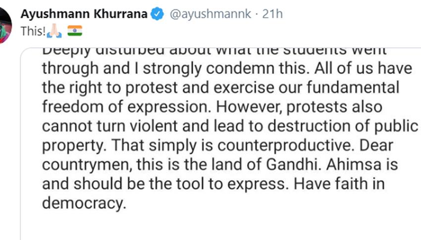 आयुष्मान खुराना ने अपने ट्वीट में लिखा-‘ ये गांधी जी की धरती है। डेमोक्रेसी पर हमें भरोसा करना चाहिए। बहुतबुरा लग रहा है कि स्टूडेंट्स के साथ ये क्या हो रहा है।’ ऐसे में ट्रोल्स इन स्टार्स के लिए बोलते दिखे कि ऐसे लोग स्टूडेंट्स नहीं हो सकते। एक यूजर ने लिखा-‘स्टूडेंट शब्द इनके लिए इस्तेमाल न करो। जो पढ़ते लिखतेहैं उन्हें स्टूडेंट कहा जाता है। खैर आप क्या जानों।’
