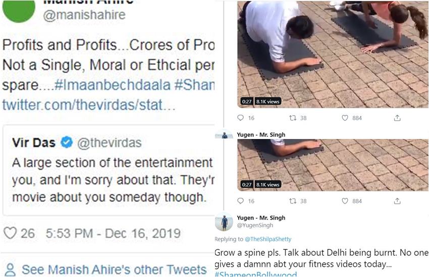तो वहीं शिल्पा शेट्टी ने फिट इंडिया पर अपना एक वीडियो शेयर किया तो उसपर भी लोगों ने शिल्पा को ट्रोल करते हुए लिखा- अपनी रीढ़ पर रहो। दिल्ली जल रही है उस पर बात करो। कोई इस वक्त तुम्हारी इस फिटनेस वीडियो को नहीं देख रहा।