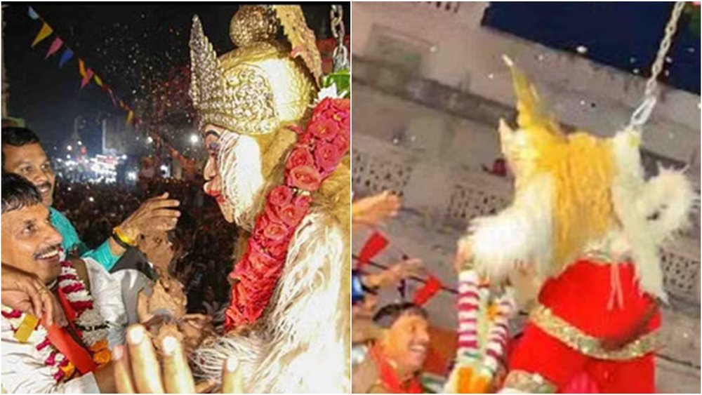 हवा में उड़ते हुए हनुमान जी सीधे मुख्यमंत्री के रैली रथ में उतरे। वहां पहले हनुमान जी ने जबरदस्त हुंकार भरी और जय श्री राम के नारे लगाए और फिर सीएम का स्वागत किया।