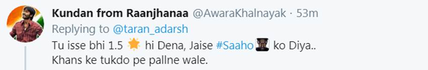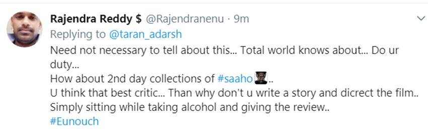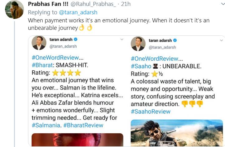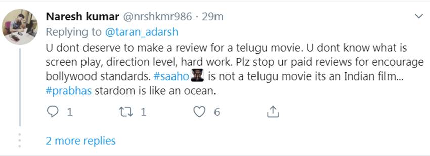 एक यूजर ने लिखा- तू इसको भी 1.5 स्टार्स ही देना। जैसे साहो को दिया। वहीं एक अन्य यूजर ने लिखा- प्रभास से ज्यादा नॉर्थ में अल्लु अर्जुन के फैन्स हैं। हिंदी में रिलीज हुई तो धमाका होगा। वहीं एक अन्य यूजर लिखता है- तुम्हें तेलुगू फिल्म का रिव्यू करने का कोई अधिकार नहीं है। तुम्हें पता नहीं है कि स्क्रीनप्ले, डायरेक्शन और हार्ड वर्क क्या होता है। बॉलीवुड के लिए पेड रिव्यूज लिखना बंद करो।