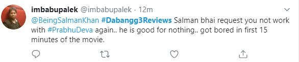 सिनेमाघरों में सलमान खान स्टारर और प्रभुदेवा द्वारा निर्देशित फिल्म दबंग 3 धमाल मचा रही है। फिल्म की कहानी लोगों को बहुत रास आ रही है। वहीं कुछ को फिल्म का फर्स्ट हाफ कुछ ज्यादा इंगेज नहीं कर रहा है। इसी को लेकर एक दर्शक ने सलमान खान को टैग करते हुए लिखा- सलमान भाई आपसे रिक्वेस्ट है कि आप दोबारा प्रभुदेवा के साथ काम नहीं करेंगे। किसी काम के नहीं हैं। फिल्म को देखते हुए शुरुआती 15 मिनट में ही बोर हो गया।