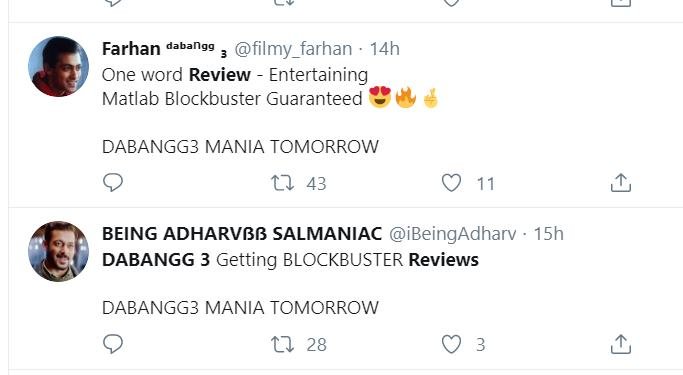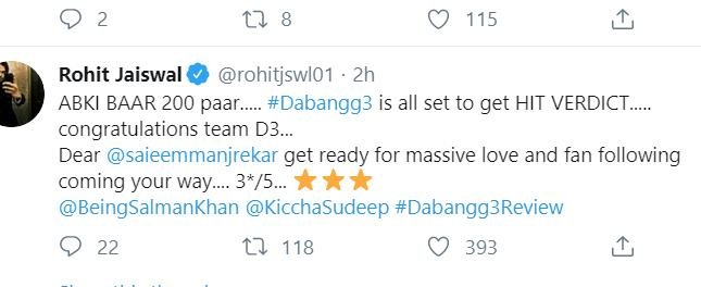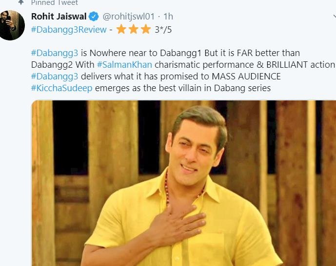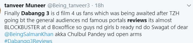 मूवी देखने के बाद एक फैन ने ट्विटर पर प्रतिक्रिया जाहिर करते हुए कहा कि सलमान की ये मूवी तीनों दबंग में सबसे अच्छी है। खासतौर पर मूवी में उस वक्त जान आती है जब जब विलेन किच्चा सुदीप की एंट्री होती है। वहीं मूवी देखने के बाद एक और दर्शक ने लिखा कि मूवी थोड़ी लंबी है। कहानी कुछ नहीं लेकिन फाइट सीन जबरदस्त हैं इसलिए एक बार देखी जा सकती है।