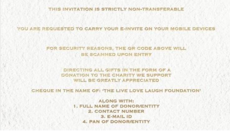 दरअसल दीपिका-रणवीर ने अपने मेहमानों ने गिफ्ट न लेने का फैसला लिया है। कपल ने अपने मेहमानों से अपील की है कि वह गिफ्ट डोनेशन के तौर पर सीधे चैरिटी फर्म ‘द लाइव लव लॉफ फॉउडेशन’ में भेजें। इसके साथ ही मेहमानों ने निवेदन किया गया है कि चेक भी चैरिटी फर्म के नाम ही दें। फैन्स दीपिका-रणवीर की शादी को लेकर खासा उत्साहित हैं। शादी की तारीख सामने आने के बाद अब रिस्पेशन पार्टी की भी डेट्स सामने आ चुकी हैं।
