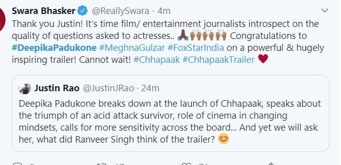 दीपिका पादुकोण की फिल्म का ट्रेलर देख स्वरा भी बोल पड़ीं- हैट्स ऑफ, यह वक्त है ऐसी फिल्मों और उनकी क्वॉलिटी पर ध्यान देने का। मेघना गुल्जार मुबारक हो। दीपिका पादुकण को भी एक्ट्रेस ने खूब सराहा।