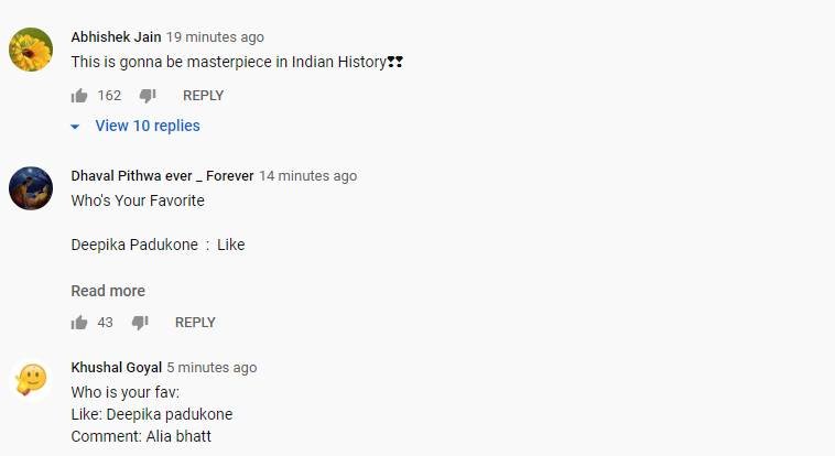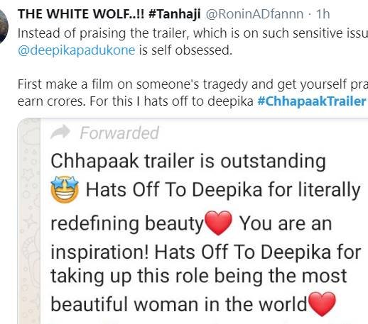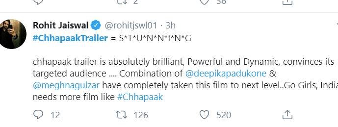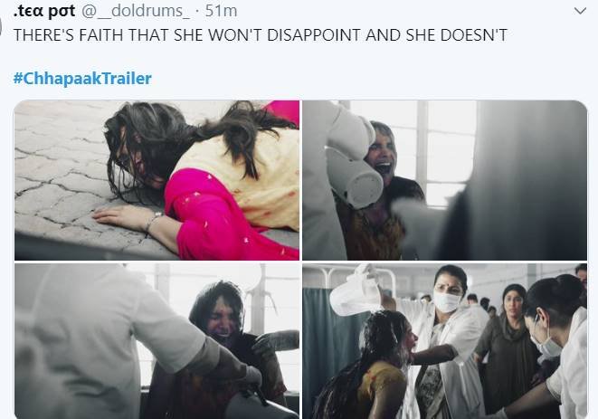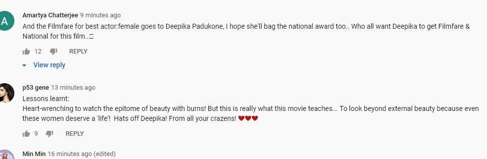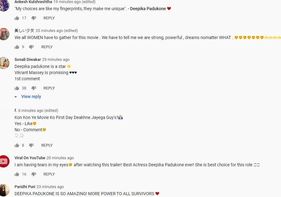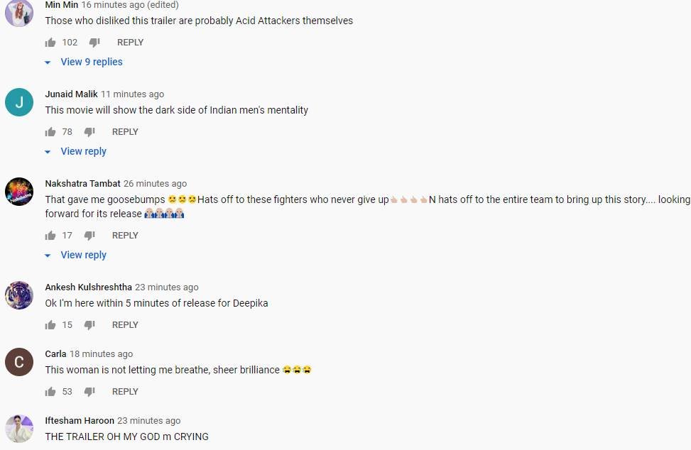 दीपिका पादुकण की फिल्म का ट्रेलर देखने के बाद से की एक के बाद एक कमेंट सामने आ रहे हैं। इस ट्रेलर को देख कर लोगों के मुंह से दर्द भरा आह निकल रहा है। लोग मालती की पीढ़ा को समझ पा रहे हैं और इस तरह के घिनौने अपराध के प्रति कमेंट के जरिए रोष प्रकट कर रहे हैं।