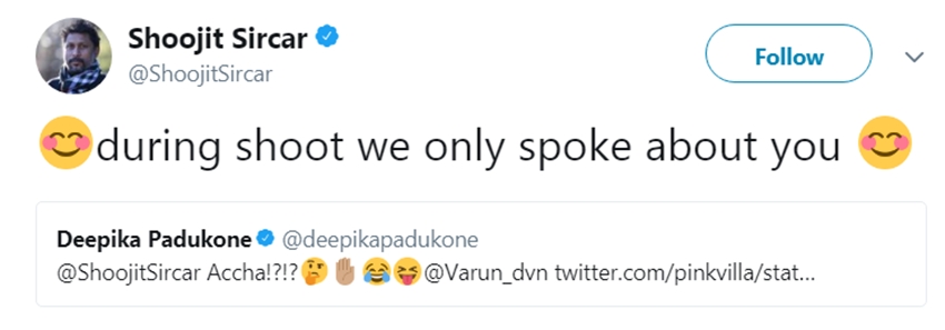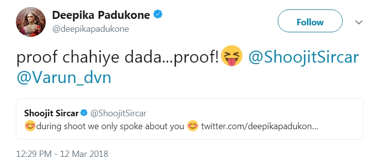 दरअसल, फिल्म ‘अक्टूबर’ के ट्रेलर लॉन्च के दौरान शूजित ने वरुण धवन की तारीफ करते हुए कहा कि वरुण मेरे दिल का टुकड़ा है। फिर दीपिका पादुकोण ने शूजित सरकार को ट्विटर पर टैग करते हुए कहा- अच्छा। इसके साथ ही दीपिका ने एक ईमोजी का इस्तेमाल किया। दीपिका के ट्वीट का रिप्लाई देते हुए शुजीत ने लिखा, “हम सेट पर तुम्हारी ही बातें किया करते हैं।” दीपिका ने ट्विटर पर तुरंत रिप्लाई देते हुए लिखा- सबूत चाहिए दादा सबूत। दीपिका ने स्माईली का भी प्रयोग किया।