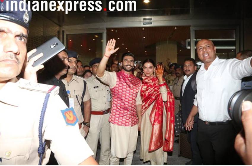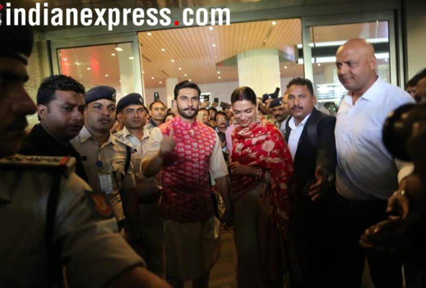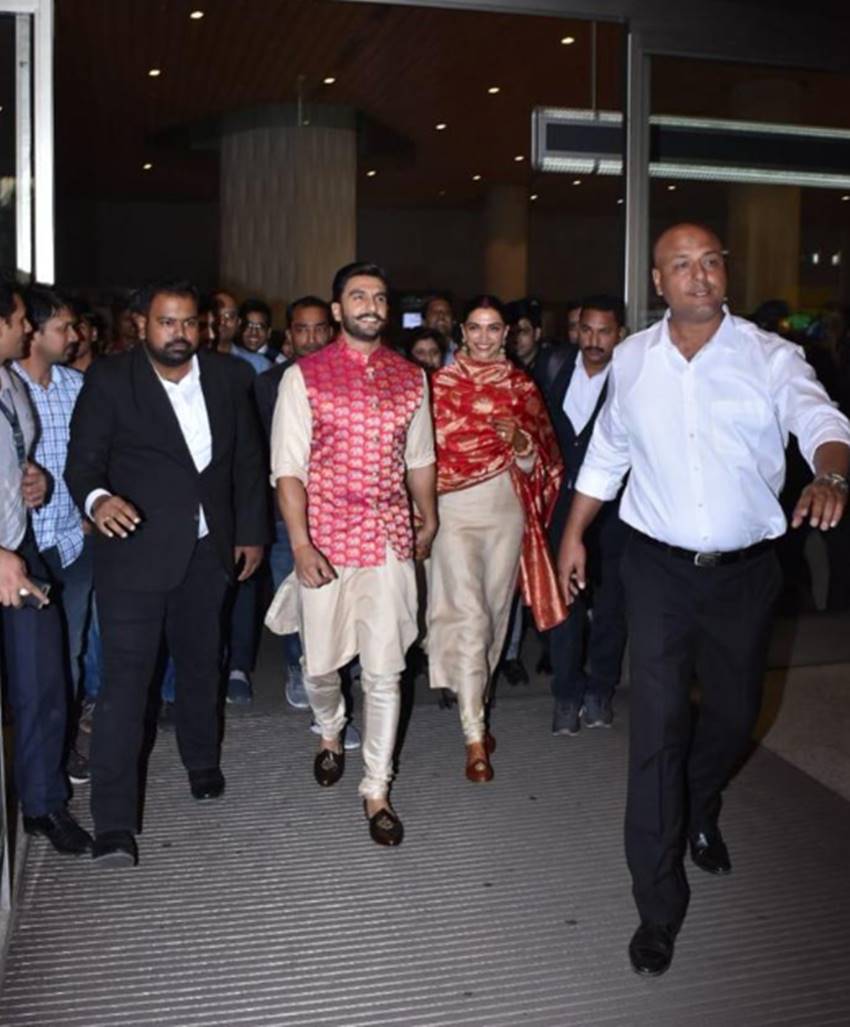 एयरपोर्ट पर रणवीर दीपिका को कैप्चर किया गया। रणवीर सिंह ने इस दौरान क्रीम कलर का कुर्ता पजामा और लाल रंग की जैकेट पहनी हुई थी। वहीं दीपिका ने भी रणवीर से मैजिंक पड़े पहने हुए थे। दीपिका क्रीम कलर के सूट और लाल हैवी चुन्नी ओढ़े दिखाई दीं।