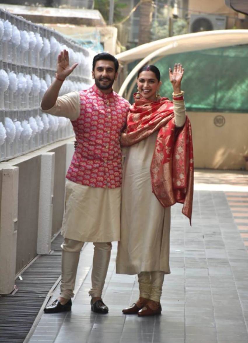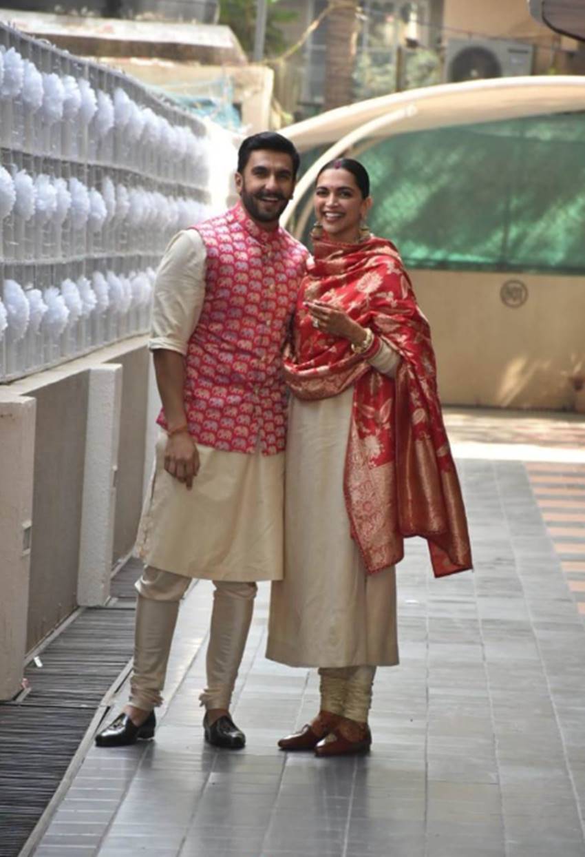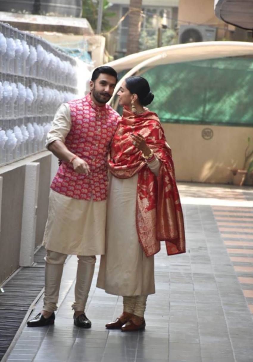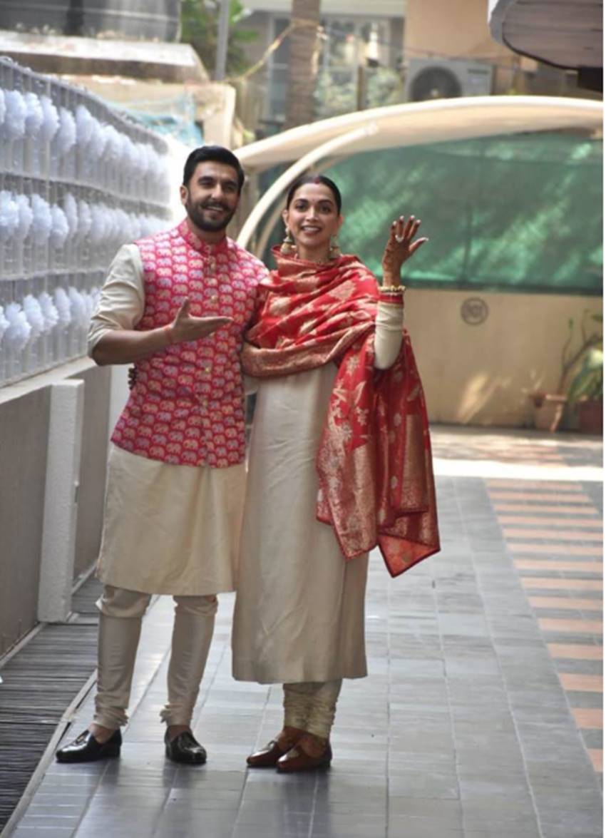 एयरपोर्ट पर रणवीर दीपिका को कैप्चर किया गया। रणवीर सिंह ने इस दौरान क्रीम कलर का कुर्ता पजामा और लाल रंग की जैकेट पहनी हुई थी। वहीं दीपिका ने भी रणवीर से मैजिंक पड़े पहने हुए थे। दीपिका क्रीम कलर के सूट और लाल हैवी चुन्नी ओढ़े दिखाई दीं।